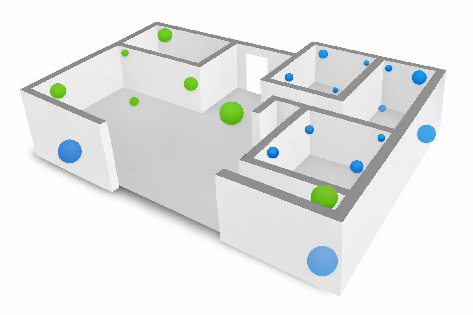 Dobrze zaprojektowany układ punktów pomiarowych powinien pokrywać przestrzeń w trzech wymiarach. Temperatura nie porusza się przecież tylko w lewo i w prawo. Czasem najbardziej „kreatywne” wyniki pojawiają się właśnie pod sufitem albo przy podłodze.